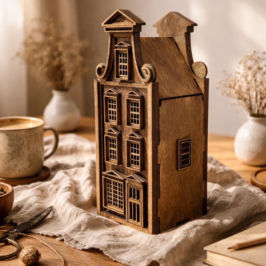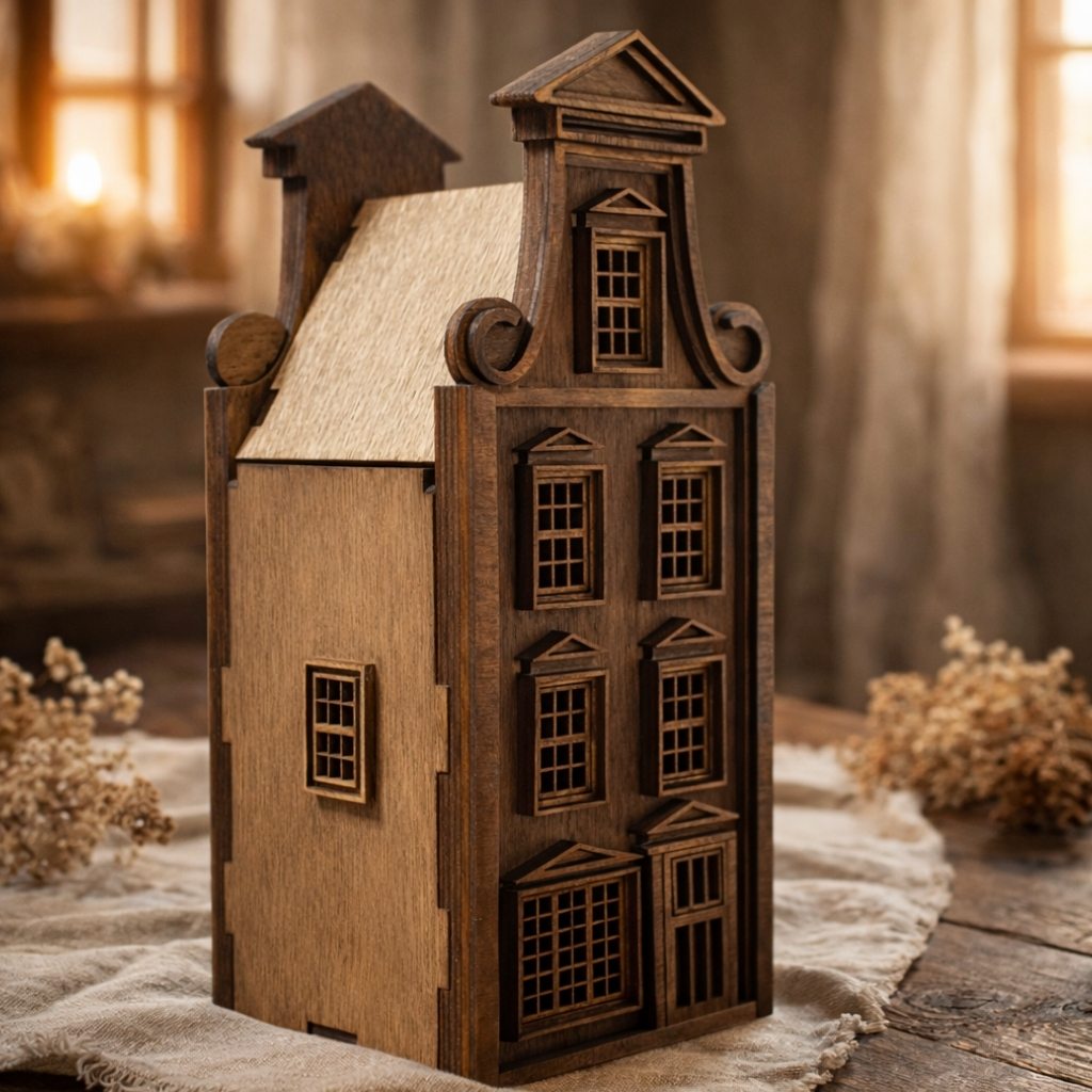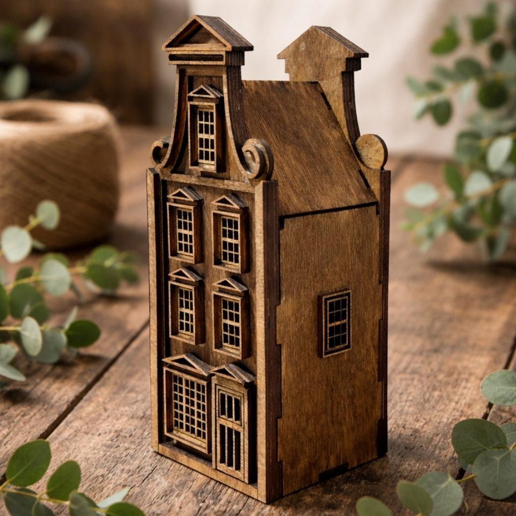 drewniany lampion domek ze sklejki. To stylowy dodatek, który wprowadzi do wnętrza ciepły klimat i przytulną atmosferę.