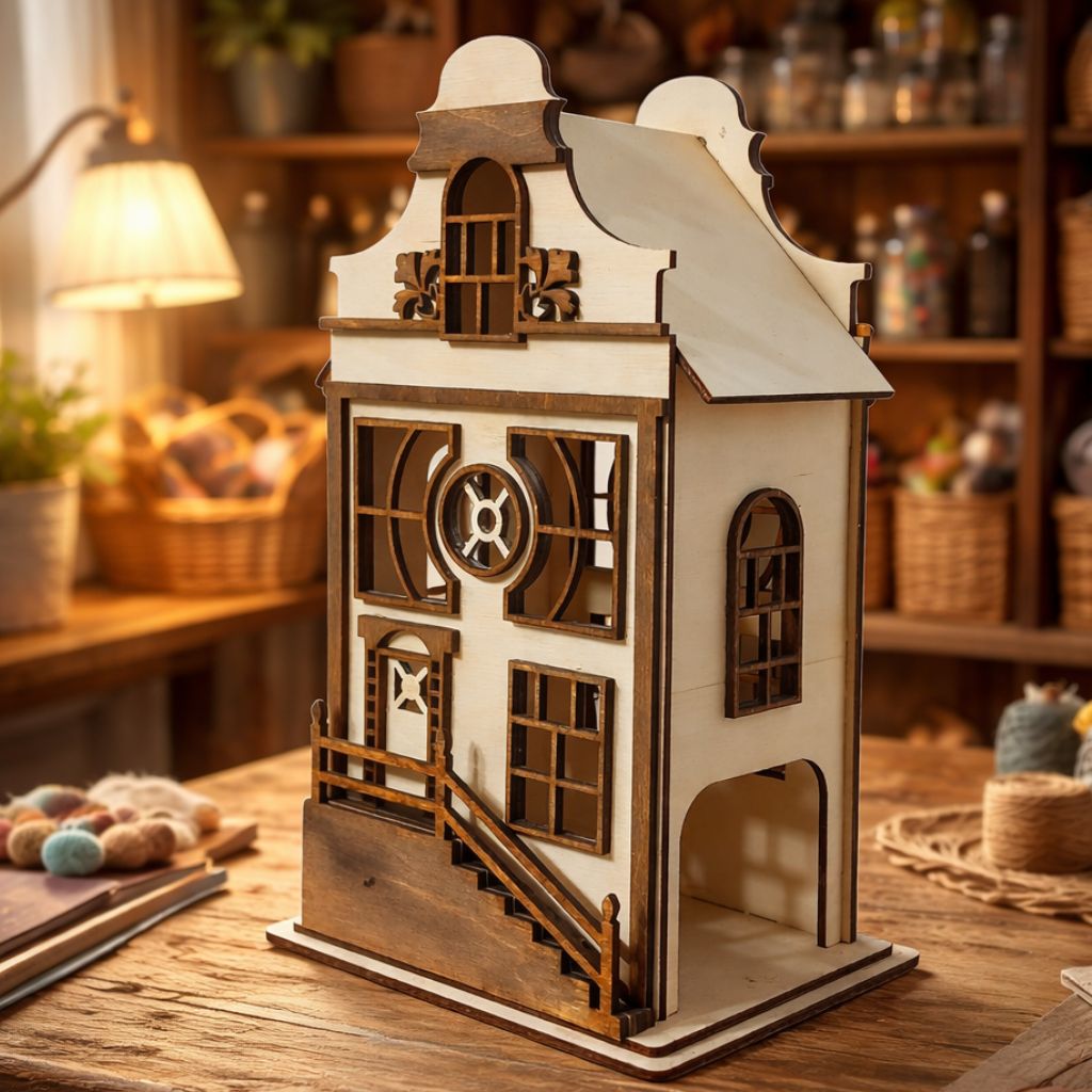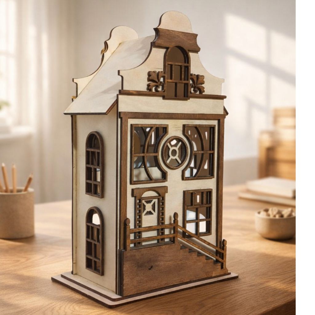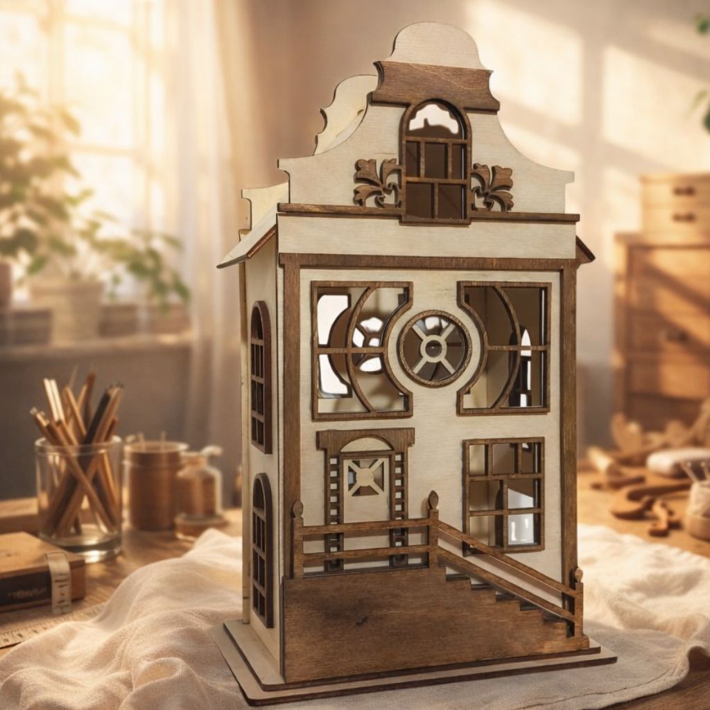 drewniany lampion domek ze sklejki, który także wprowadzi do wnętrza ciepły i przyjemny klimat.