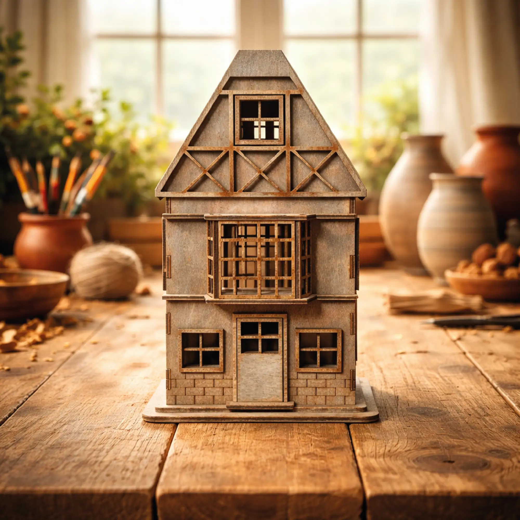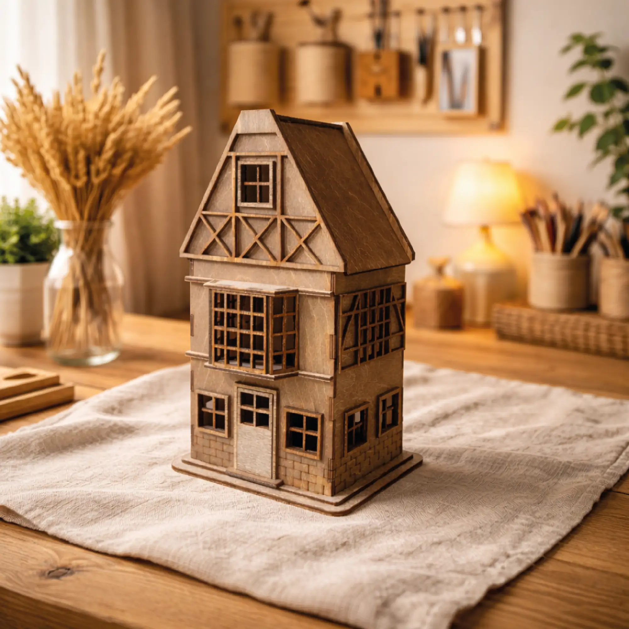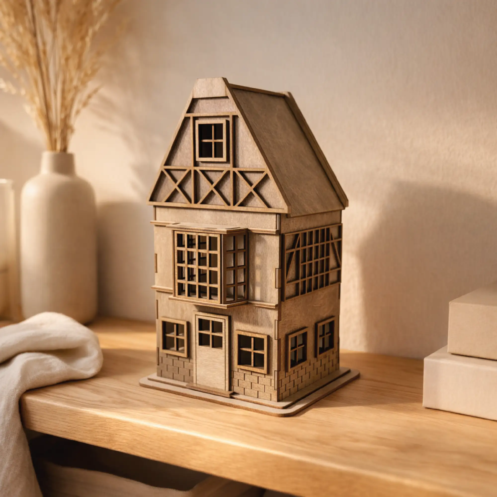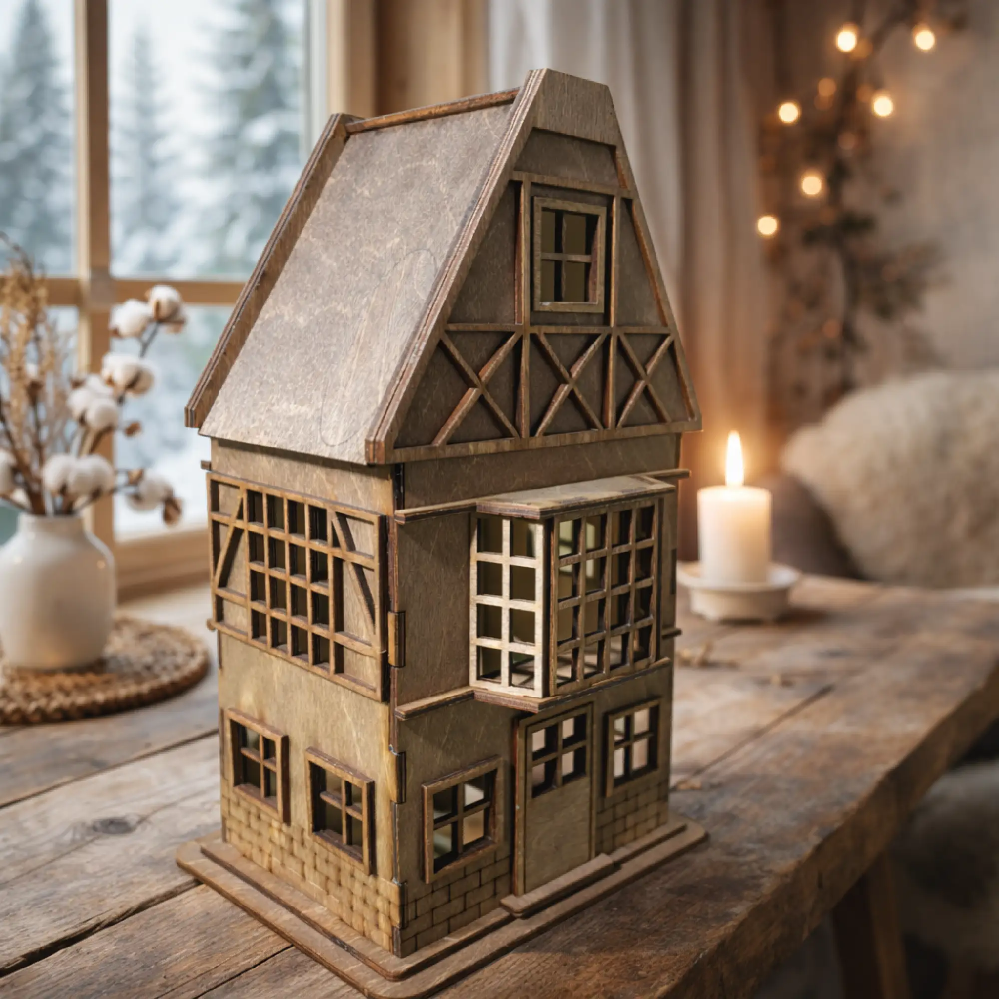 drewniany lampion domek ze sklejki, który doskonale uzupełnia aranżacje inspirowane naturalnymi materiałami.