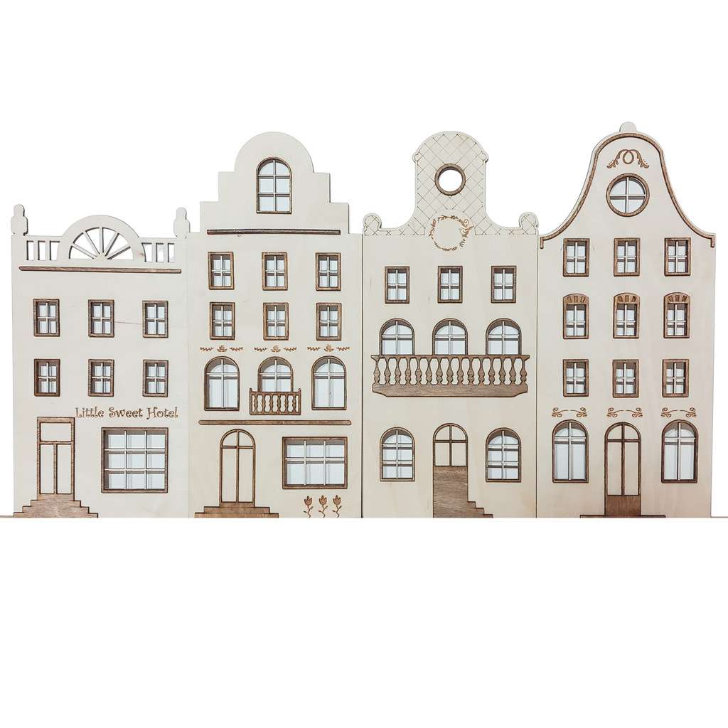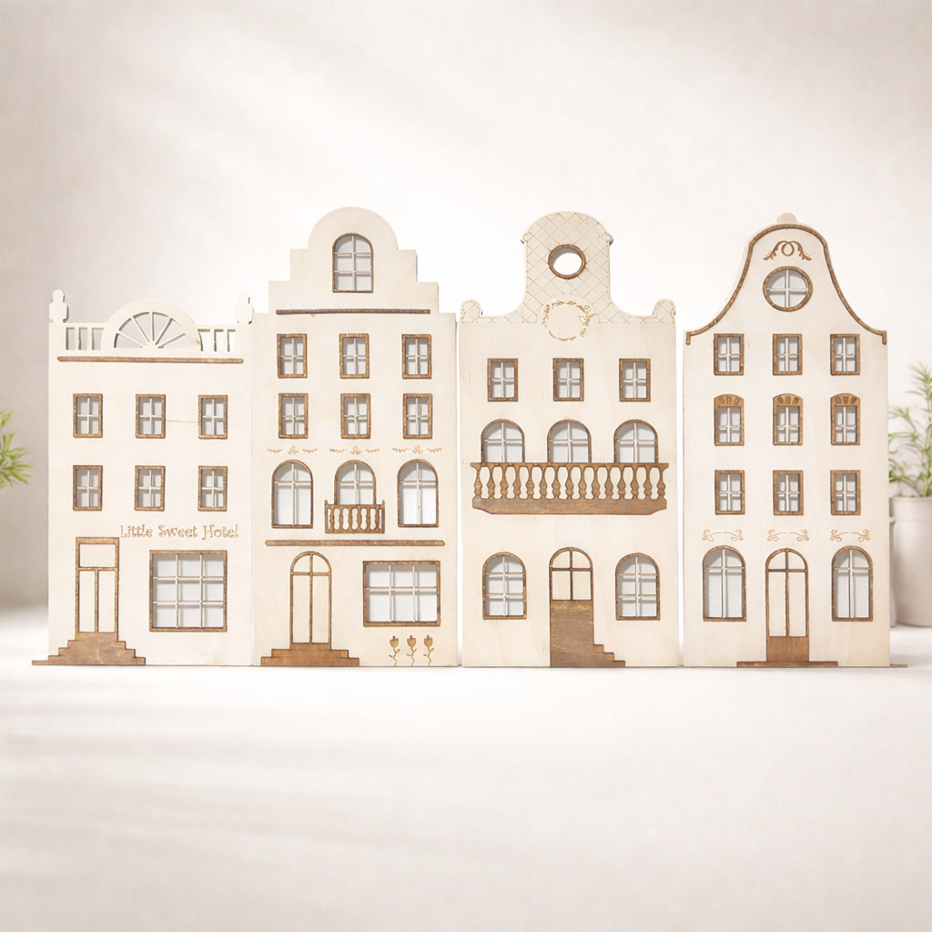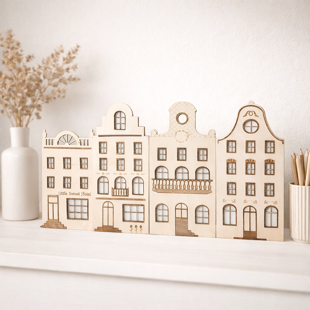 Zestaw czterech kamieniczek różni się wysokością od 25 do 31 cm, co buduje rytm i czytelną kompozycję. Ustawione obok siebie tworzą spójną linię zabudowy.
