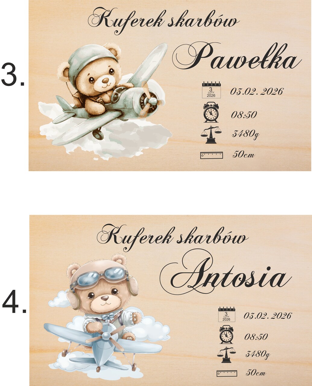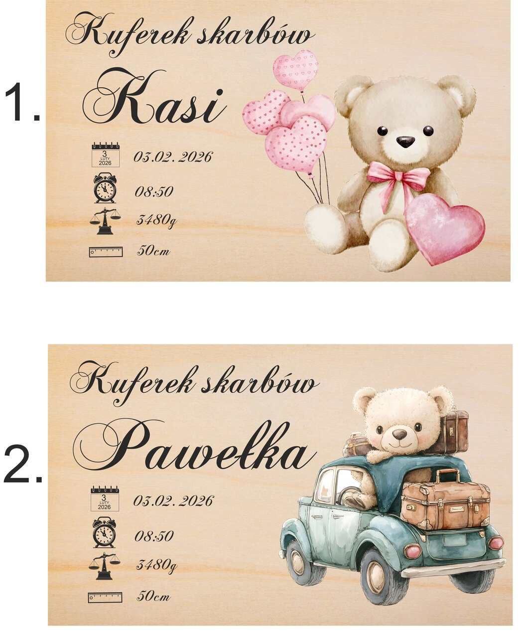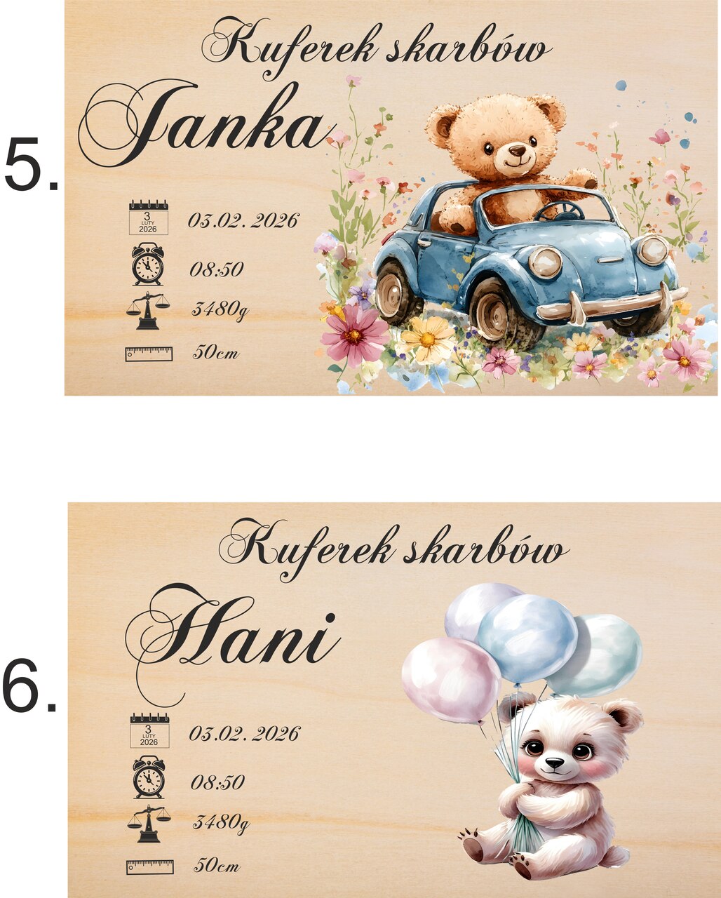Podczas składania zamówienia należy wpisać w polu „Uwagi do zamówienia” numer wybranego motywu nadruku oraz dane dziecka. Na tej podstawie przygotujemy indywidualny projekt, dzięki któremu kuferek wspomnień będzie dopasowany do Twojego zamówienia.