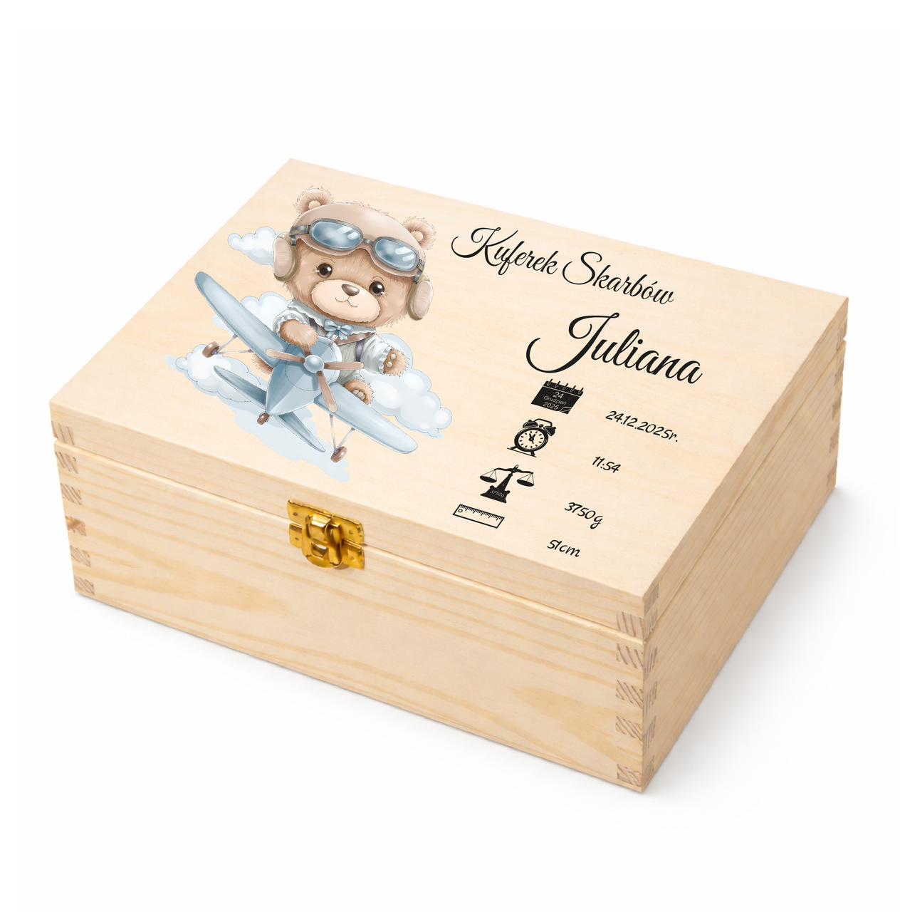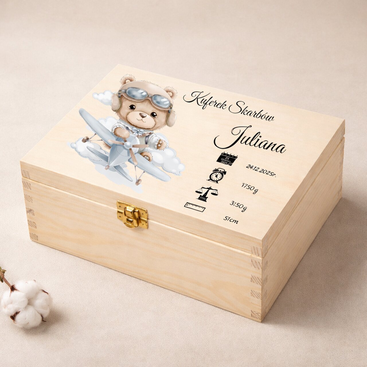 Na wieczku produktu znajduje się metryczka z imieniem dziecka oraz danymi urodzenia wykonana trwałym nadrukiem UV. Taki kuferek wspomnień jest nie tylko praktyczny, ale również bardzo osobisty. To pamiątka, do której można wracać po wielu latach.