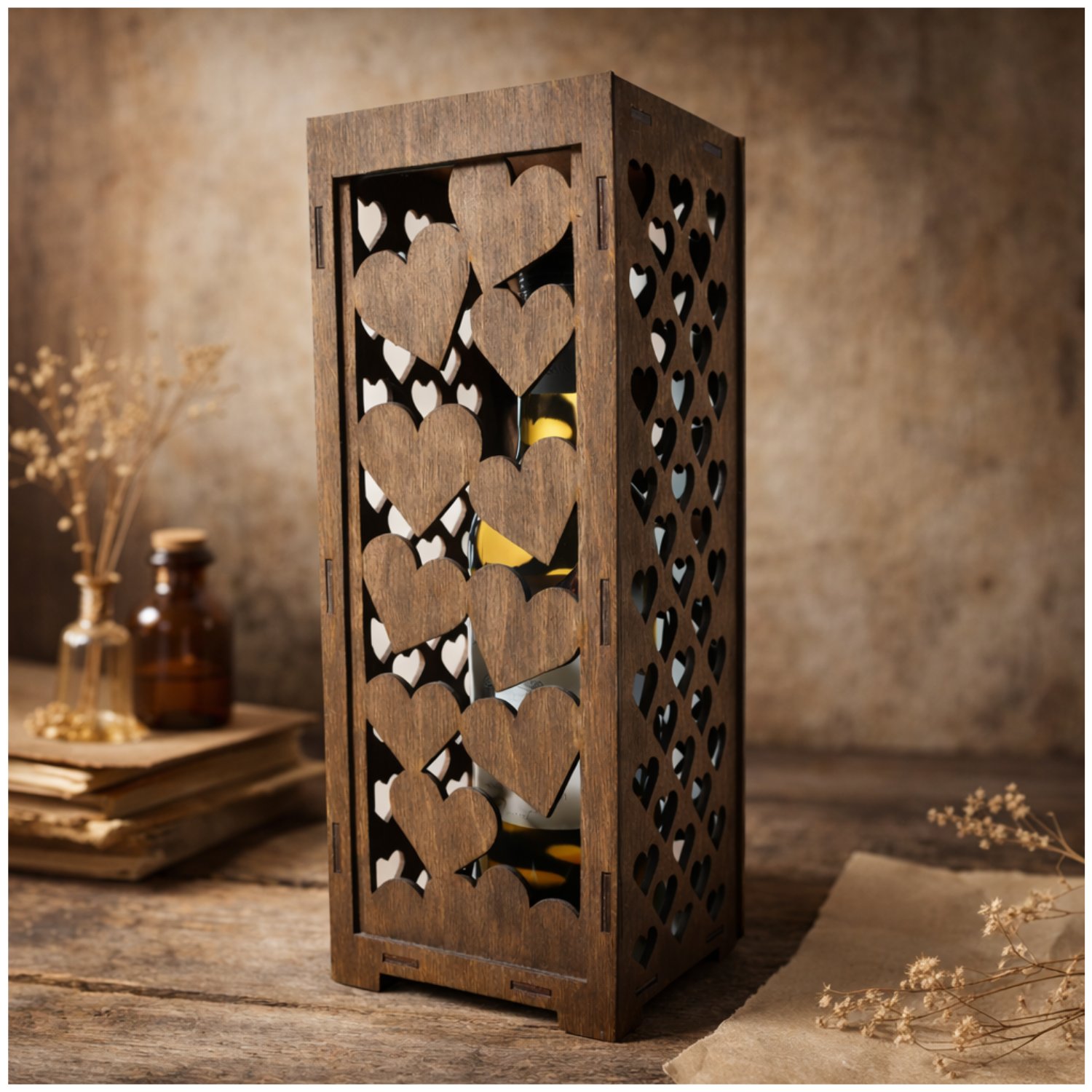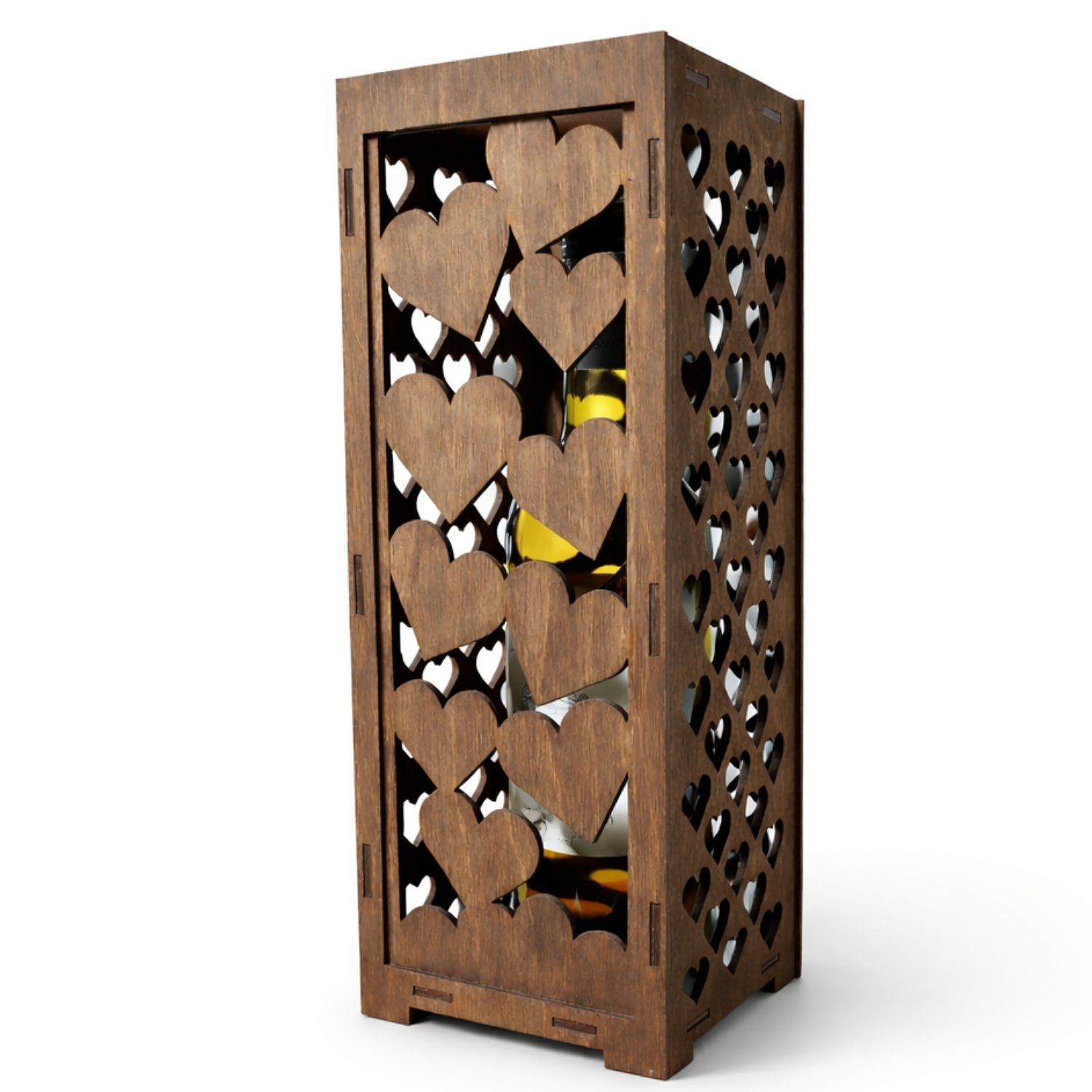 Smukła forma z bejcowanej sklejki eksponuje butelkę zamiast ją ukrywać. Front oraz boki skrzynki zostały wycięte w powtarzalny motyw serc, który tworzy lekką, dekoracyjną strukturę.