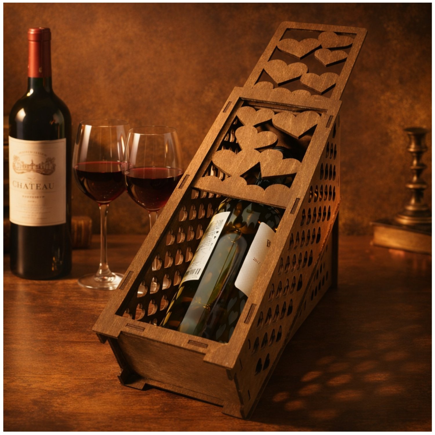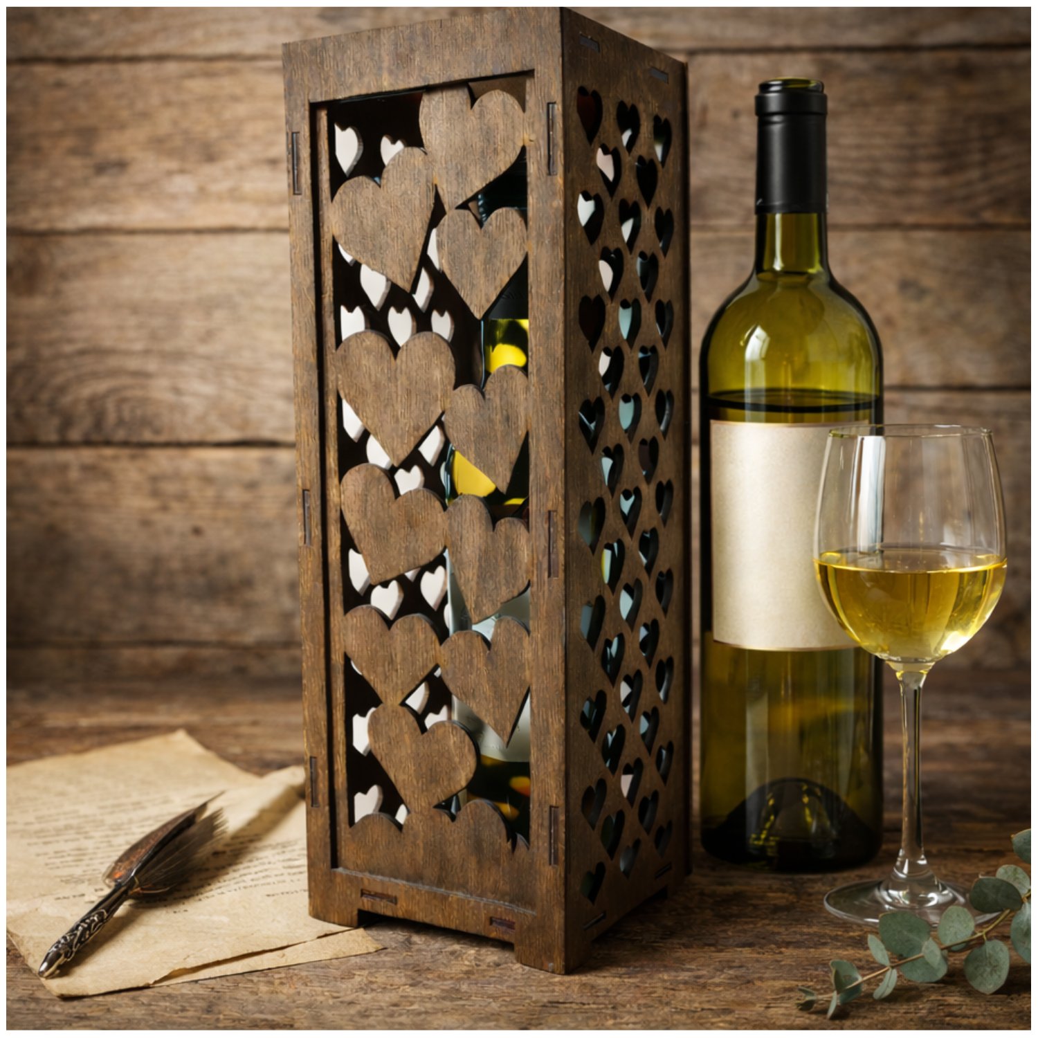 Drewniana skrzynka na butelkę wina z ażurowym wzorem serc