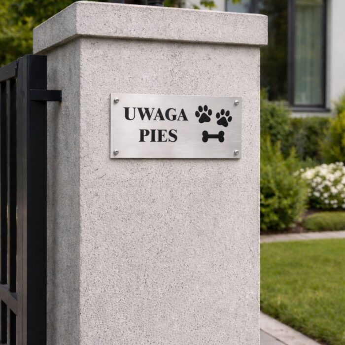 - Czytelny napis „Uwaga pies” – informacja widoczna od razu przy wejściu