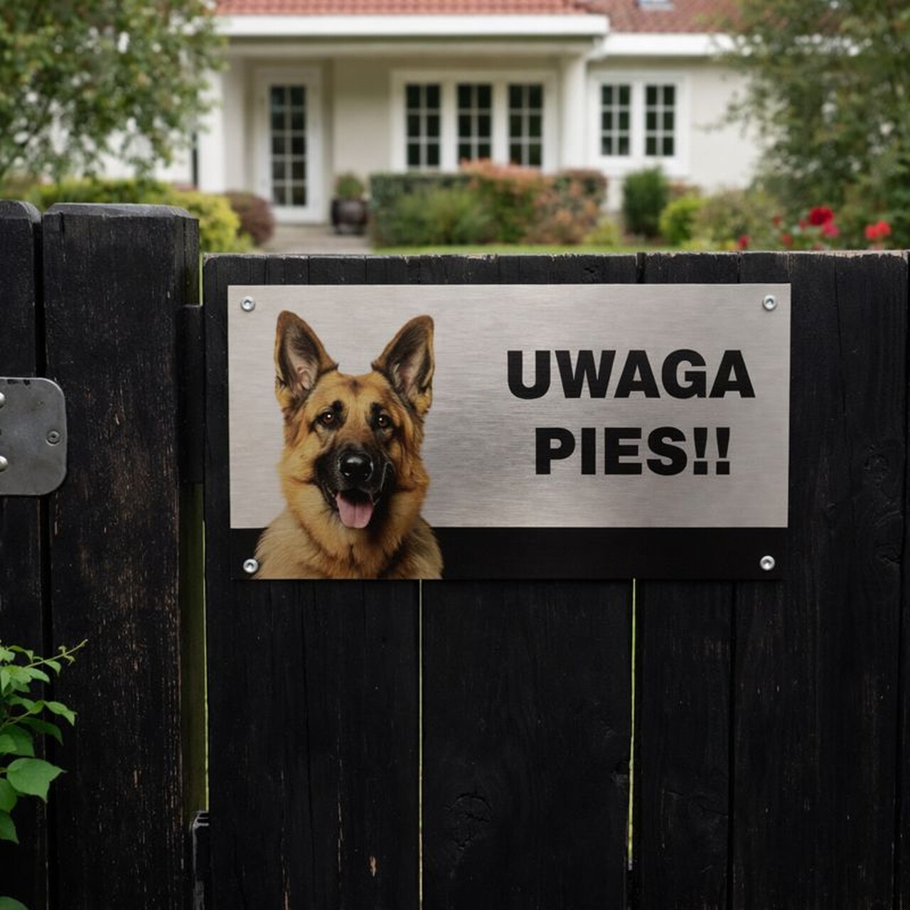 Projekt tabliczki łączy czytelny komunikat z grafiką owczarka niemieckiego – jednej z najbardziej rozpoznawalnych ras psów stróżujących. Tabliczka dobrze prezentuje się zarówno na nowoczesnych ogrodzeniach metalowych, jak i na klasycznych bramach lub drewnianych płotach.