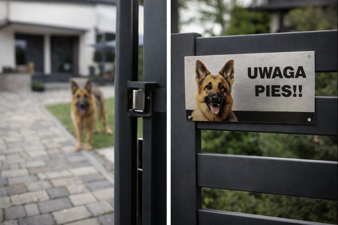 Tabliczka „Uwaga pies” pomaga również uniknąć nieporozumień i jasno informuje o zasadach wejścia na teren posesji.